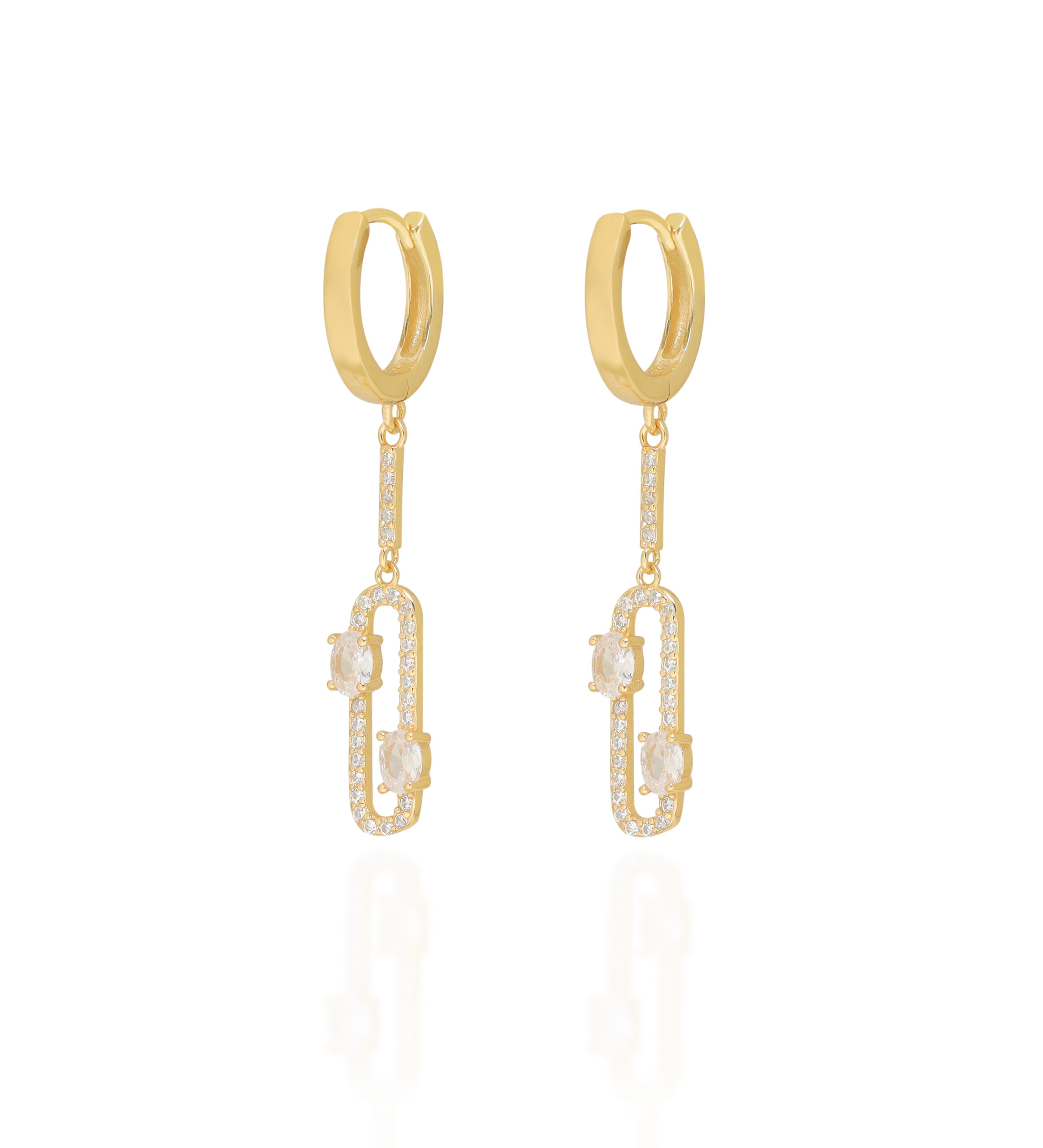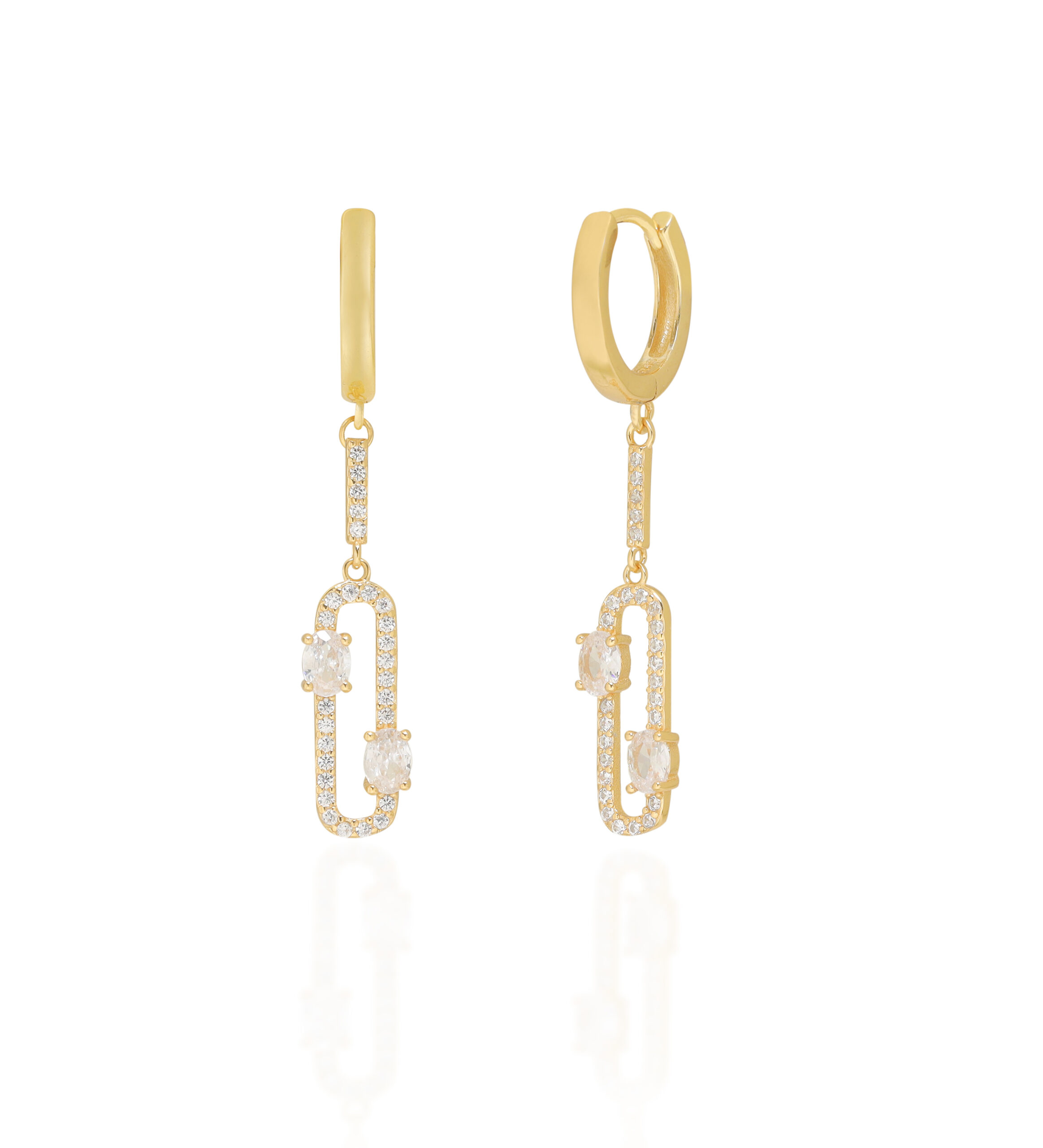 • Design: Half hoop earrings with a dangling oval link and embedded stones