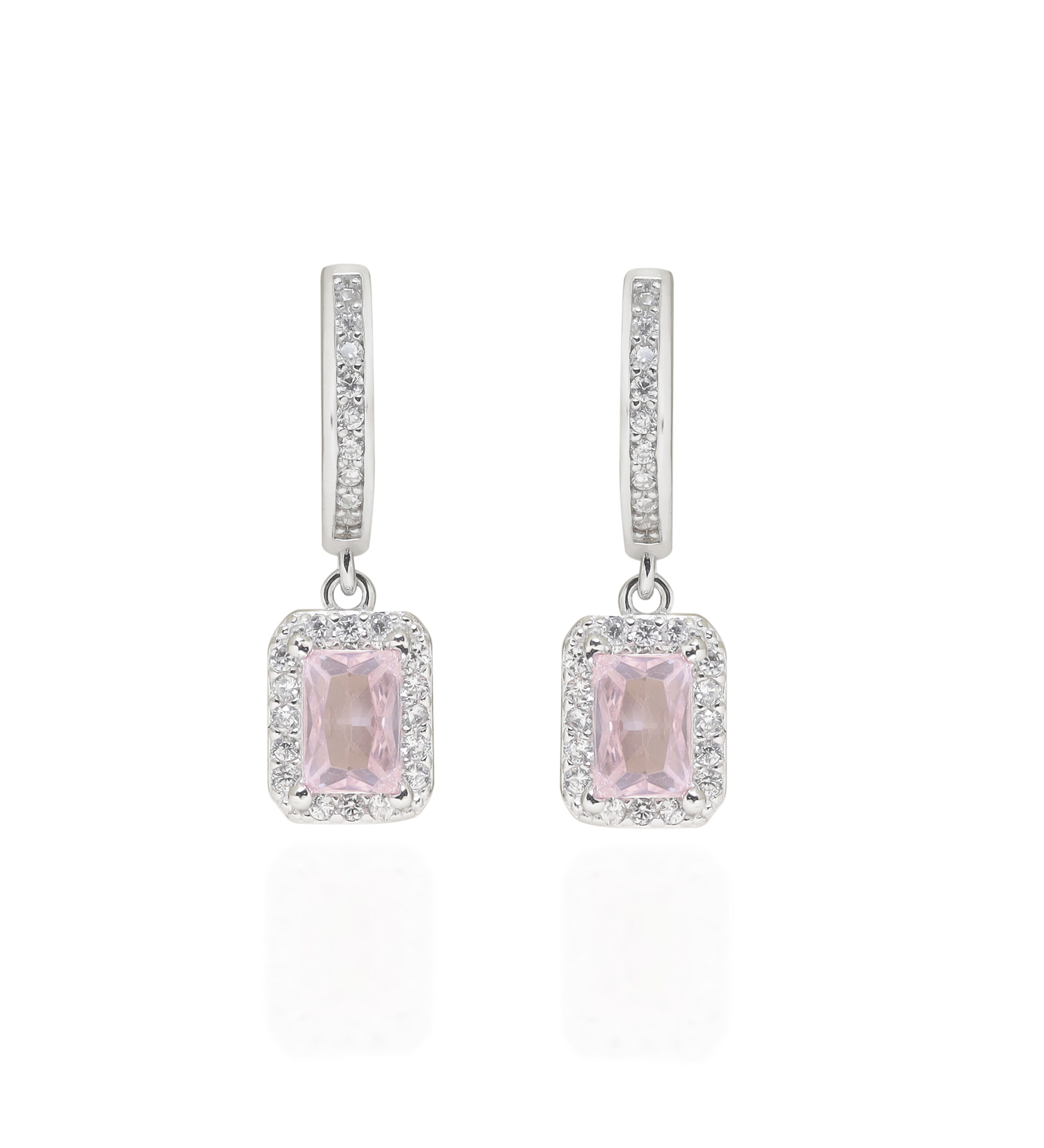 These silver earrings feature a radiant pink cushion-cut stone surrounded by shimmering white zircon stones, suspended gracefully from a zircon-studded half hoop. The combination of blush tones and brilliant sparkle creates an elegant yet modern statement piece.