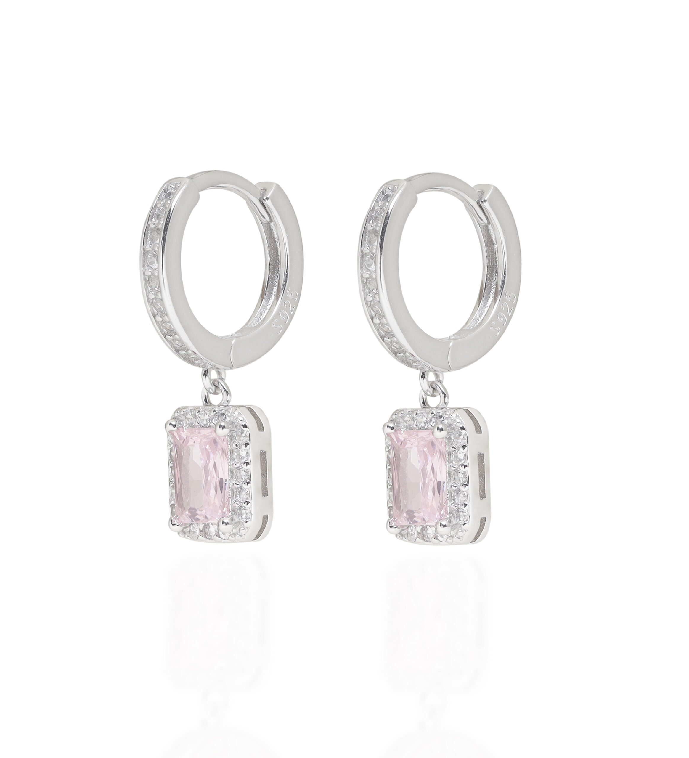 • Design: Half hoop earrings with a dangling cushion-cut pink stone framed in zircon sparkle