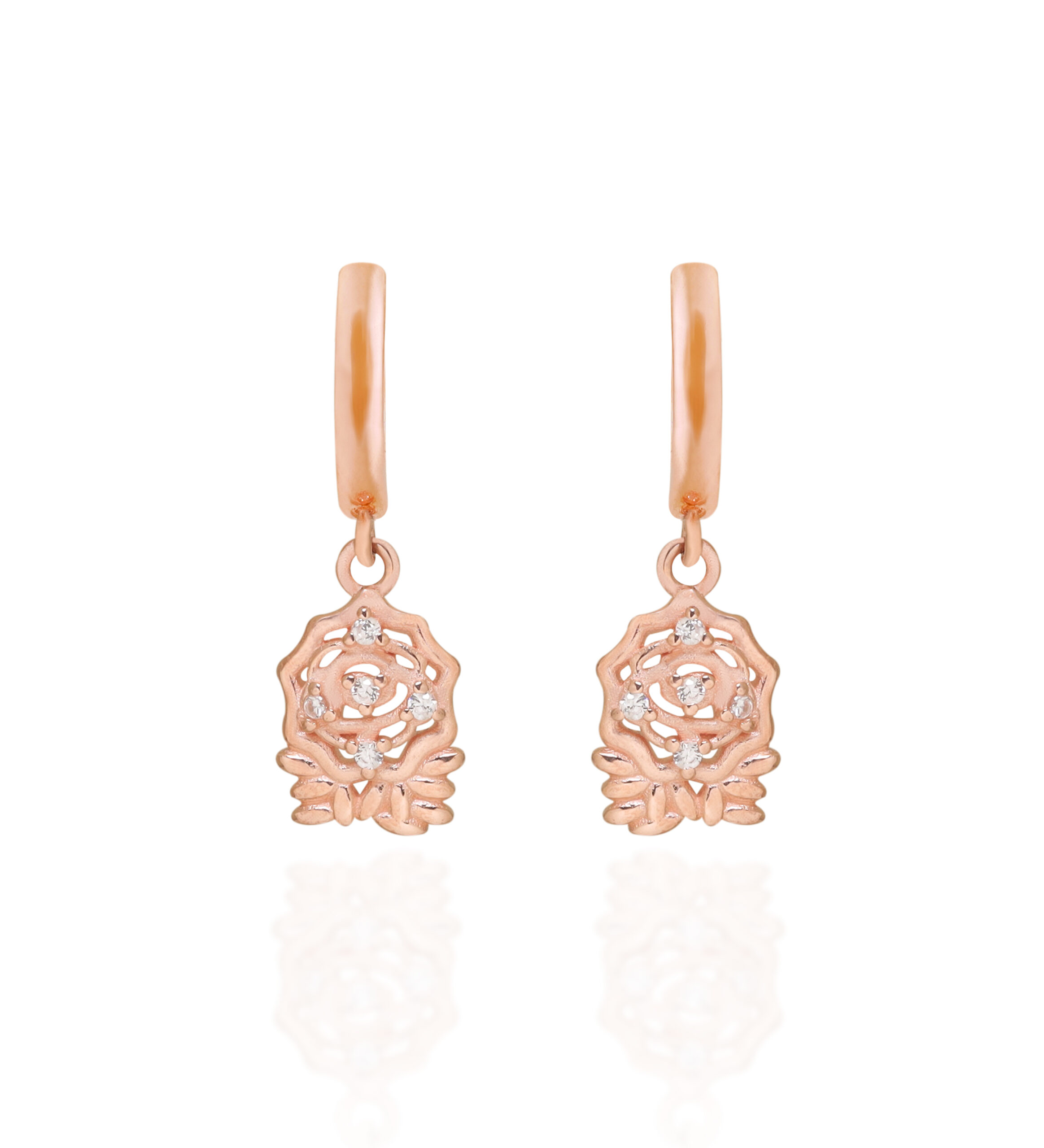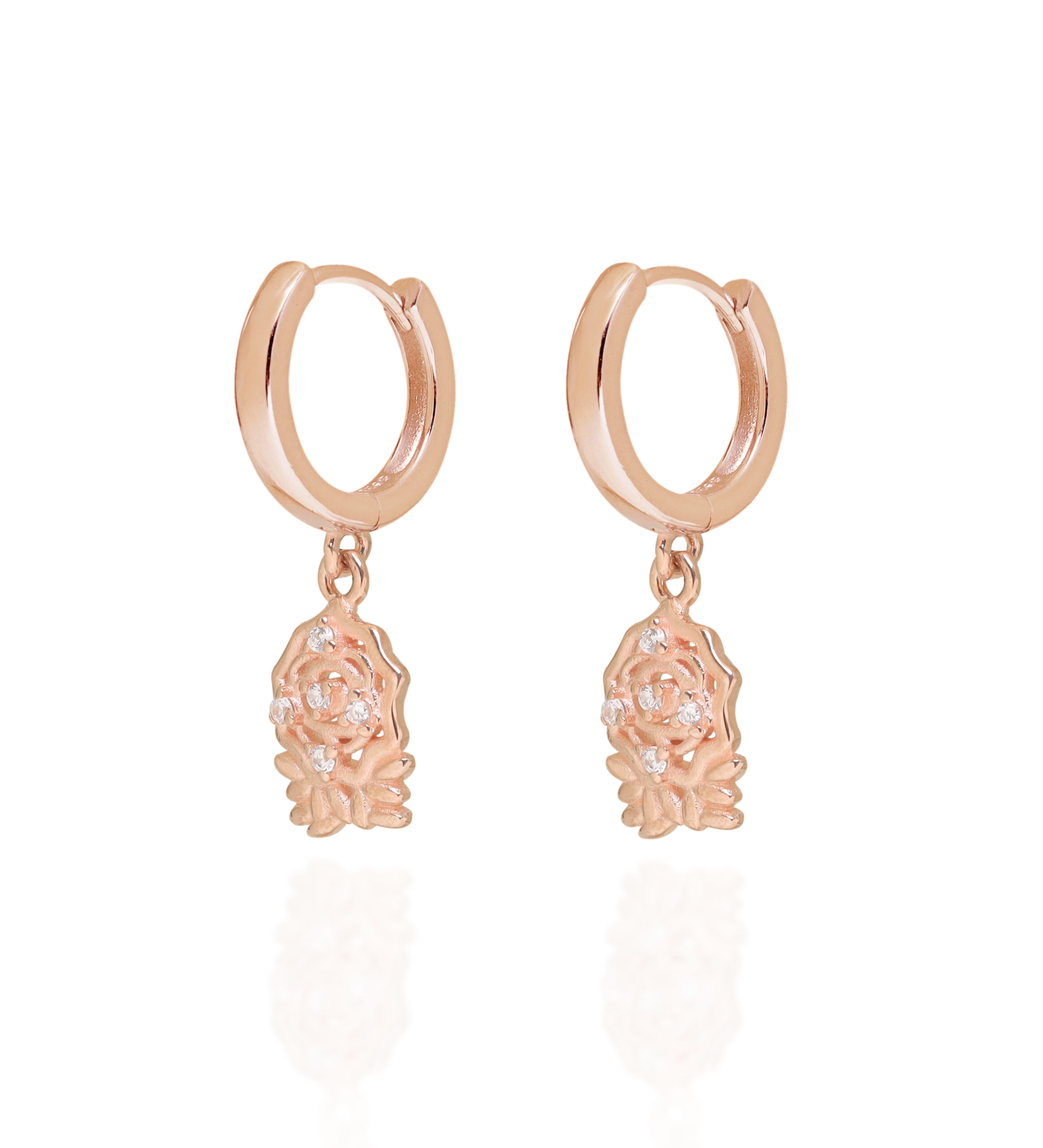 Featuring half hoops in a warm rose gold tone with a dangling floral cluster, these earrings combine sophistication with a playful touch.