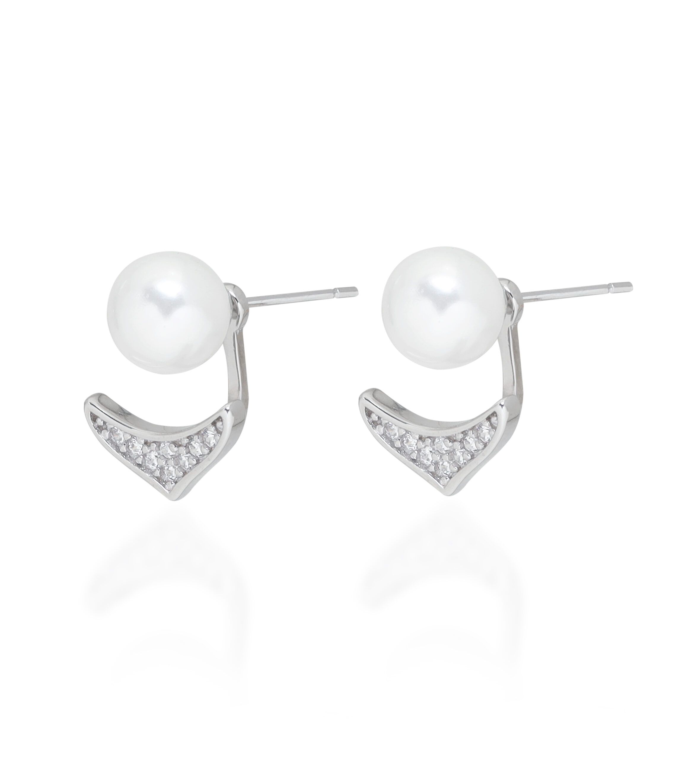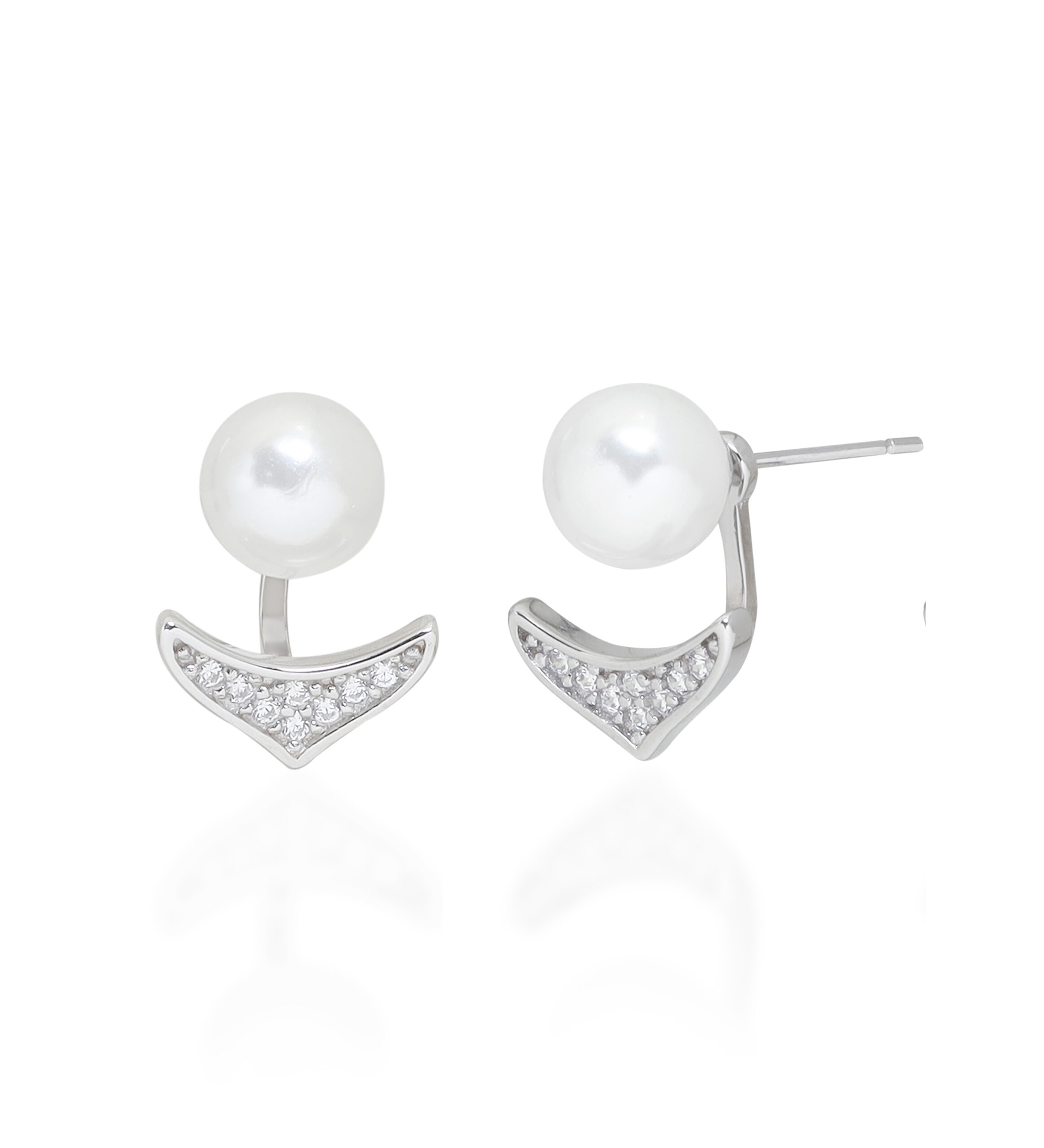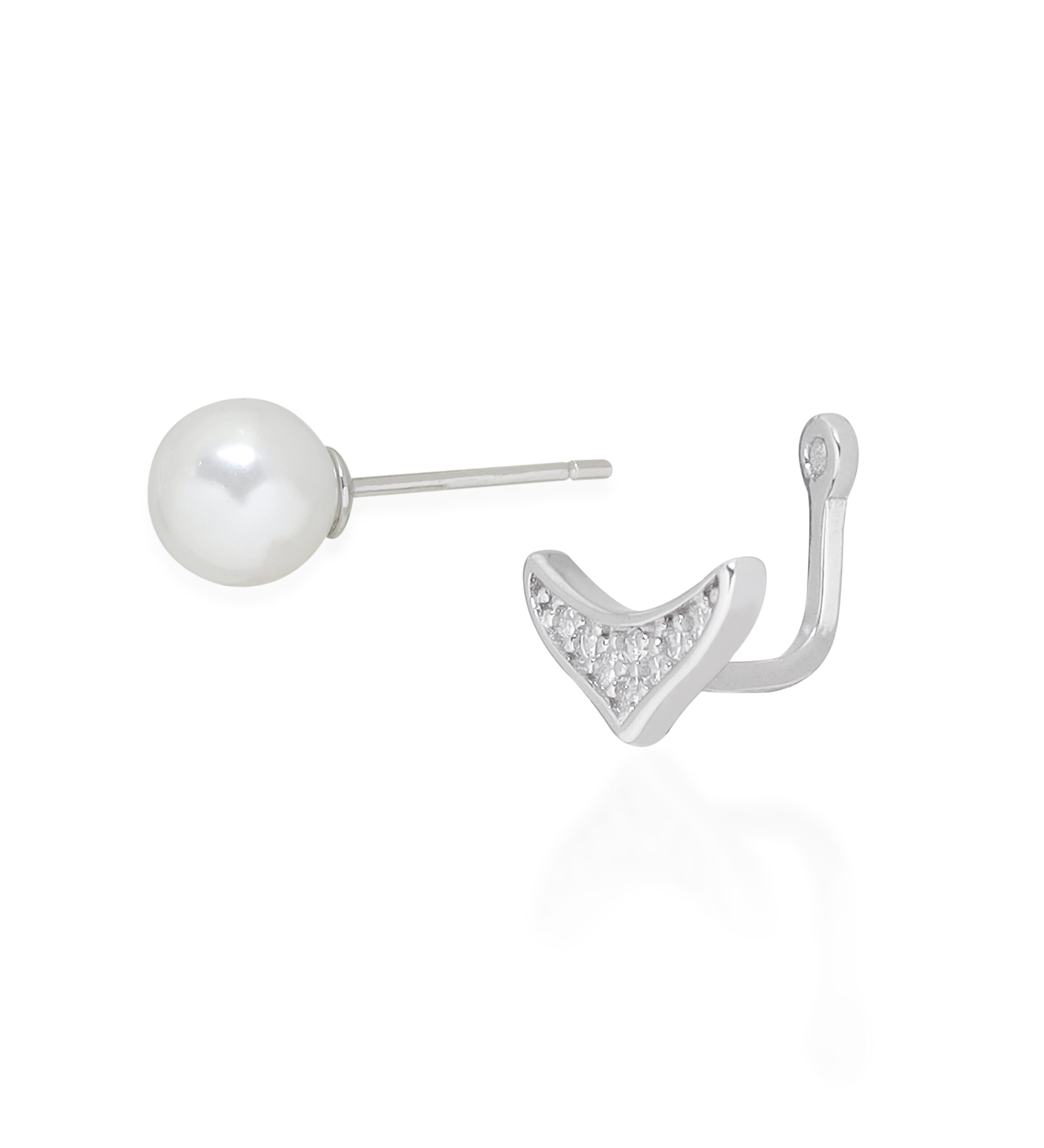 Crafted in sterling silver, these earrings feature a luminous pearl stud paired with a pavé-set zirconia V-shaped jacket, creating a versatile and chic look.
