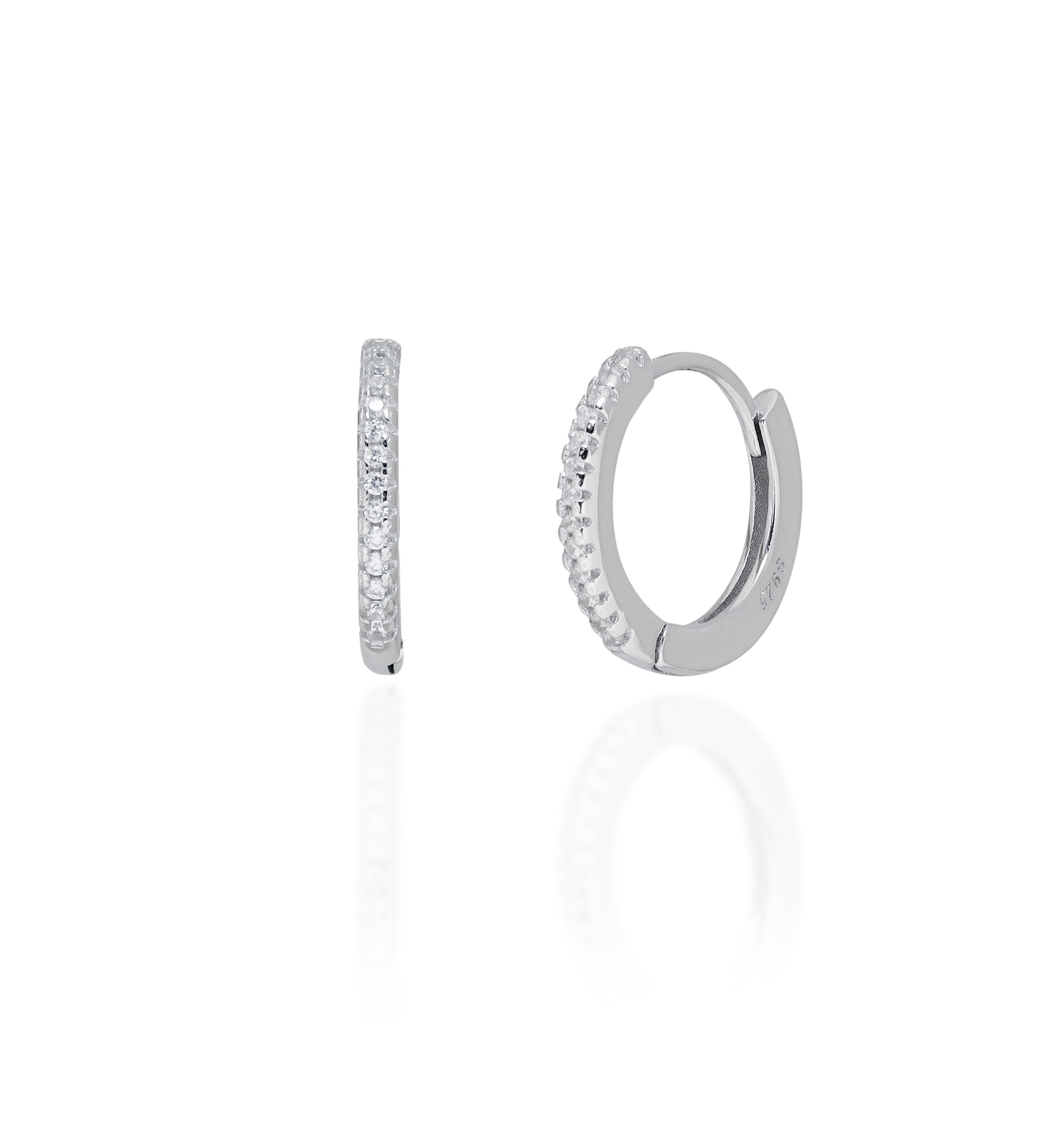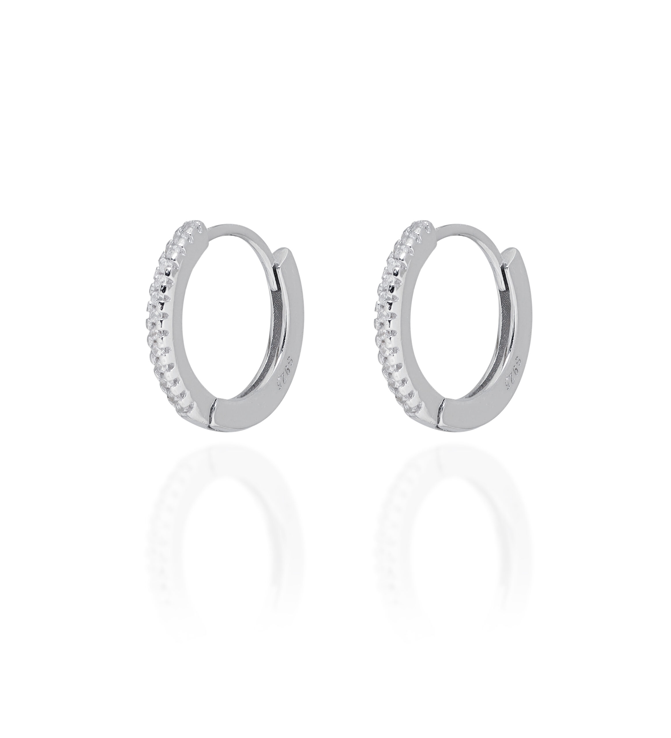 These sleek half-hoop earrings feature a neat row of sparkling cubic zirconia on polished silver, making them versatile for any occasion.