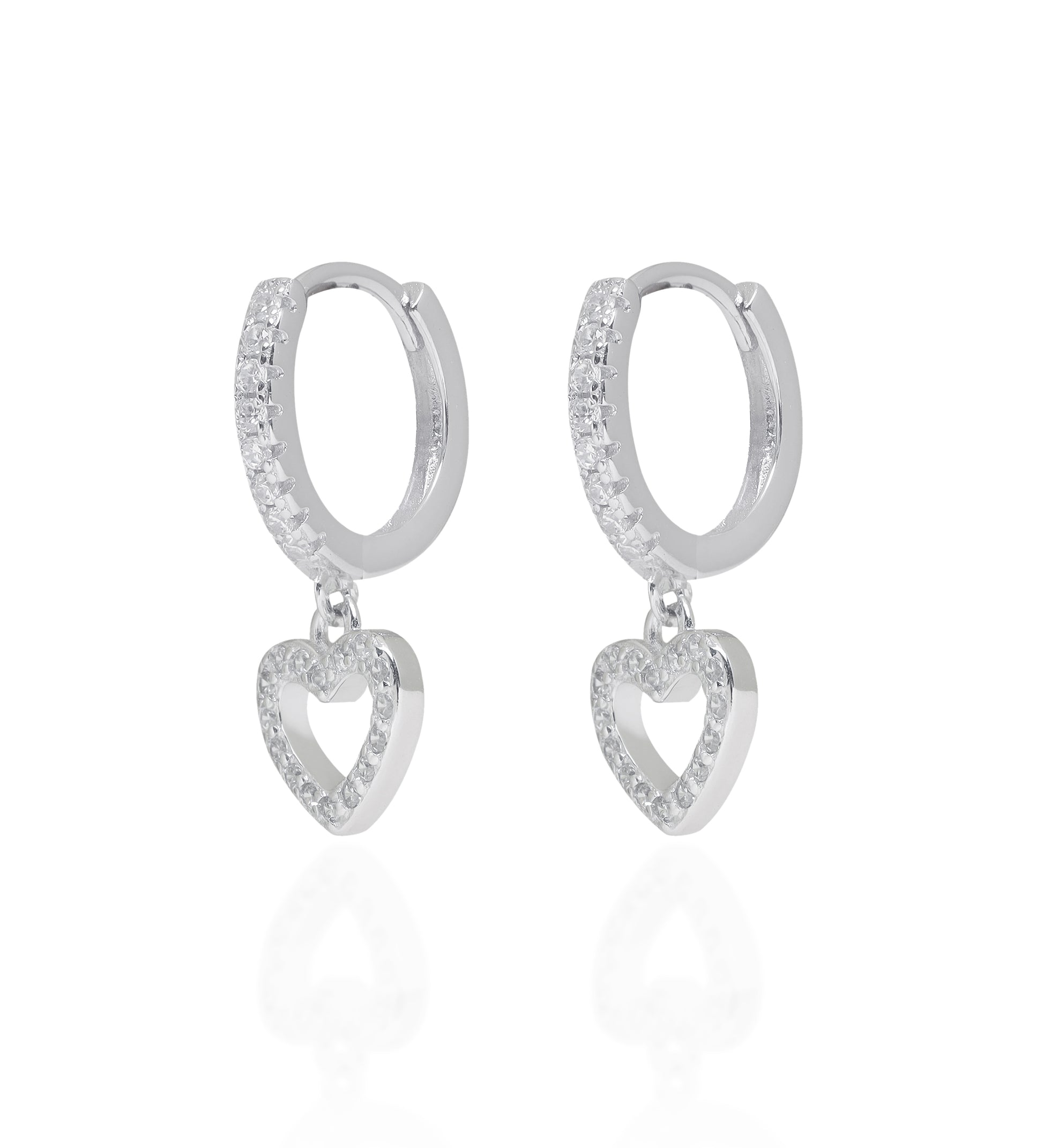 These silver earrings feature a sparkling open-heart charm gracefully suspended from a zircon-studded half hoop, capturing the essence of love and elegance in a timeless silhouette.